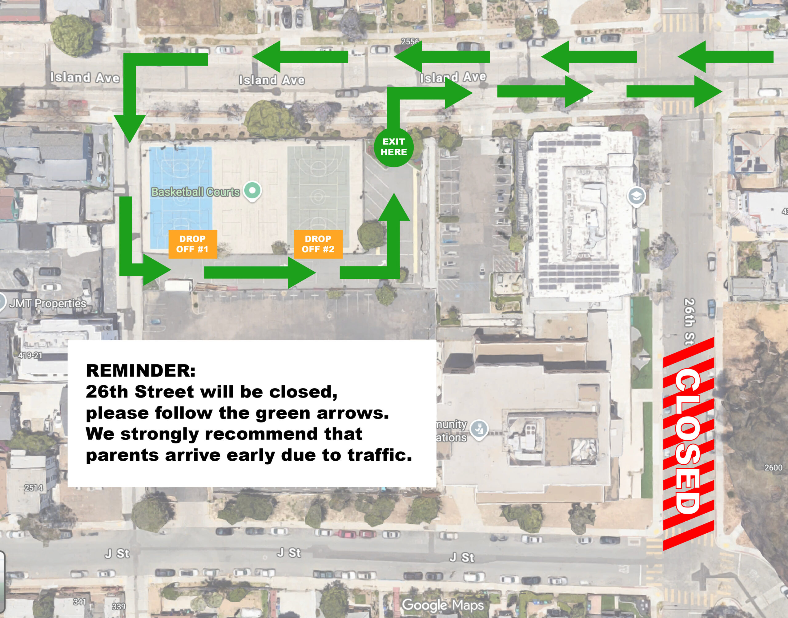 26th Street will be closed due to construction. For this reason, we strongly advise all families to follow the map provided and use the designated route for drop-off.