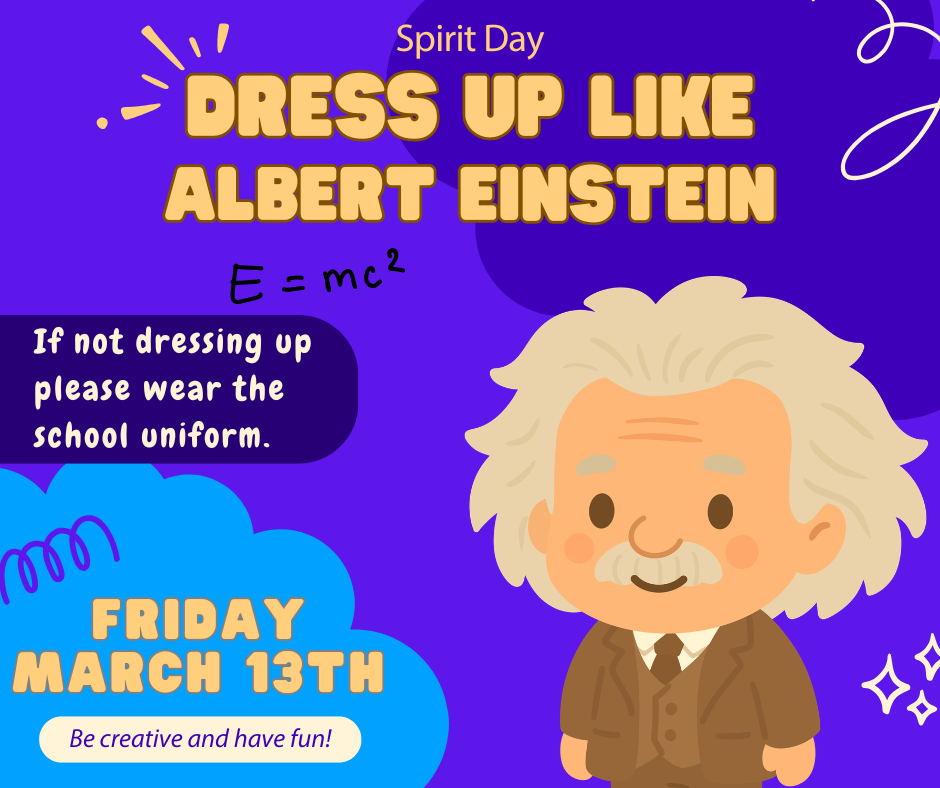 Elementary School: Friday, March 13th – Dress Up Like Albert Einstein Spirit Day
