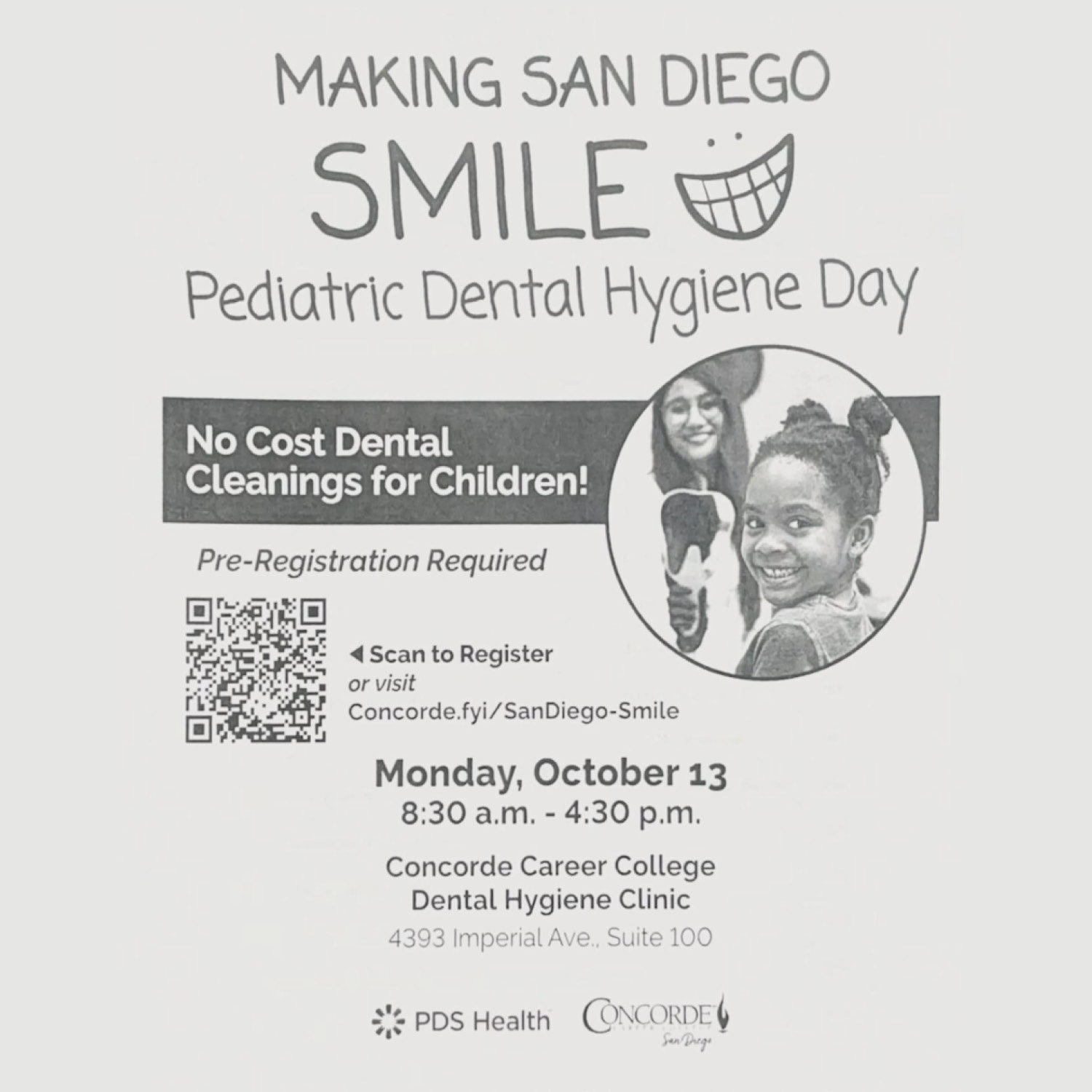 NO COST DENTAL CLEANING FOR CHILDREN! If you are interested in a cleaning, please pre-register by visiting concorde.fyi/SanDiego-Smile