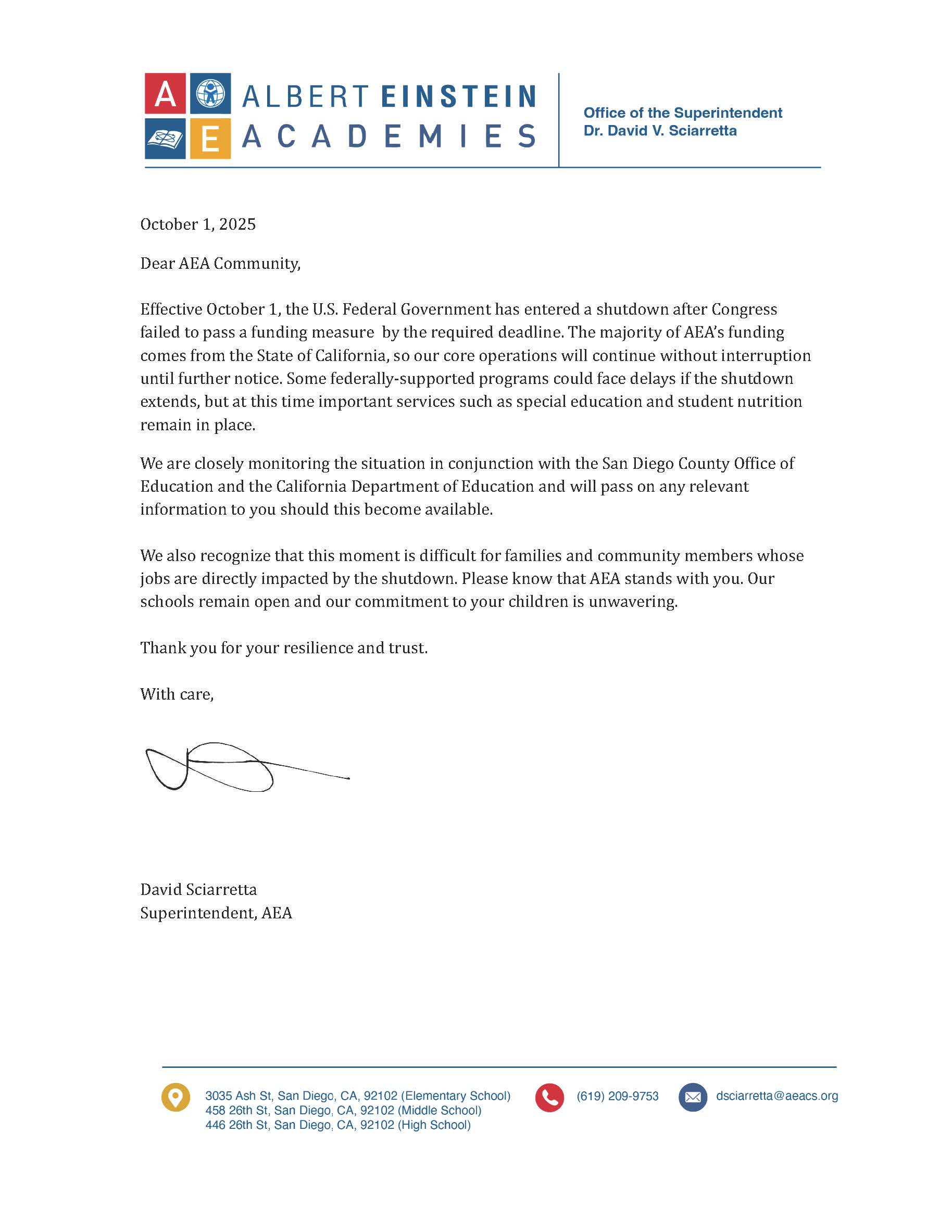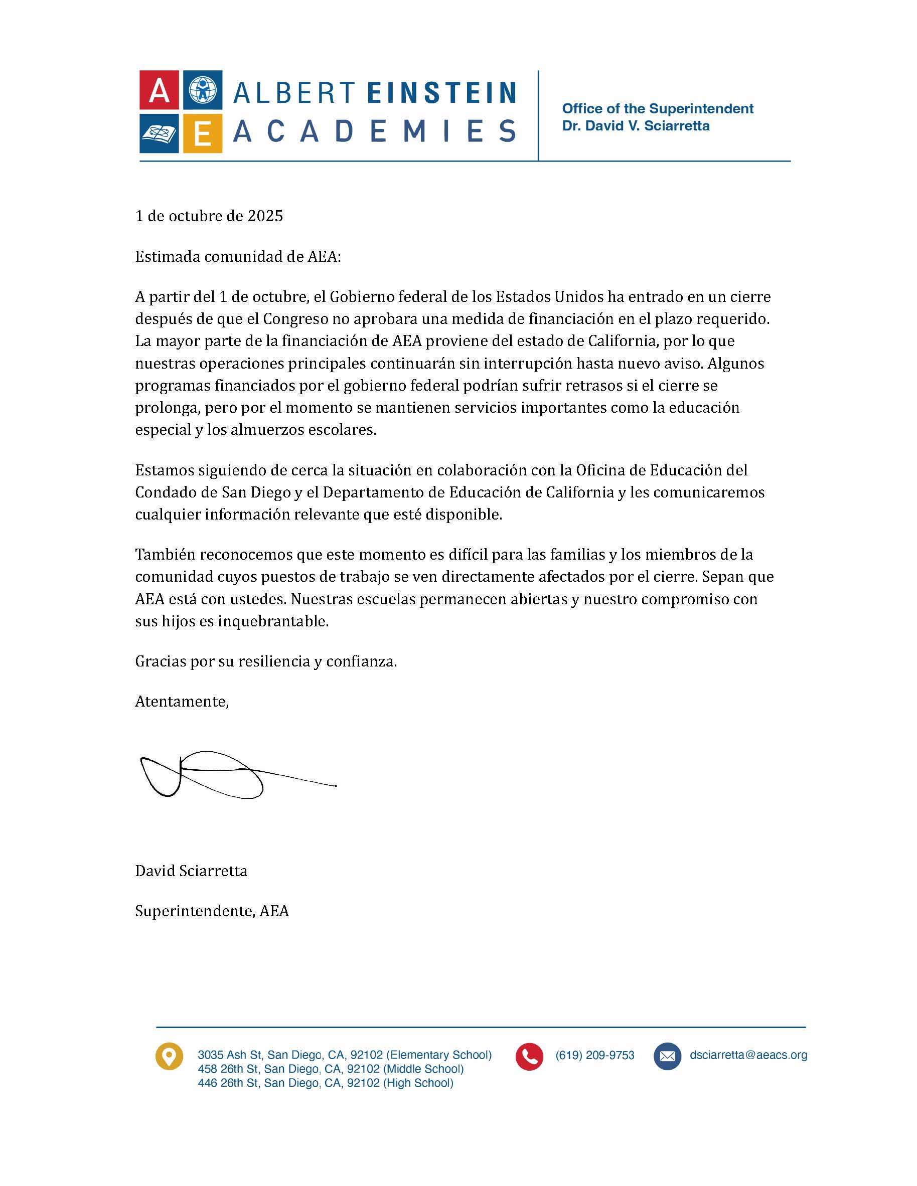 Home About AEA Mission, Vision, & Core Values AEA International Student Exchange Program Board of Trustees Careers Charter Documents Executive Leadership Team International Baccalaureate Curriculum Language Programs School Safety Plan Title IX Calendar & News Official Academic Calendar Monthly Leadership Message News and Announcements AEA In the News Programs AEA Student Support & Services AfterStein After School Program AEACES Art Athletics AEA Music ExchangeStein International Student Exchange Program International Baccalaureate Curriculum IB PYP at AEACES IB MYP at AEACMS Language Programs School Uniform Free Uniform Checkout Special Education and Mental Health Services Policies & Procedures Policies Comprehensive Complaint Policy View All School Procedures AEACS Student Planner Handbook 2024-2025 AEACES School Procedures AEACMS School Procedures Annual Notification for Parents Committees English Learner Advisory Committee (ELAC) School Site Council (SSC) Family Resources AEA Student Support & Services After School AfterStein After School Program Additional After School Activities Bell Schedules Educational Rights for Foster and Homeless Youth German Language Resources Grade Level and Department Websites UFLI K-2 Resources Kindergarten First Grade Second Grade Third Grade Fourth Grade Fifth Grade Sixth Grade Music Program German Music Library Physical Education Health Information Parent University Schedule and Resources PowerSchool Student/Parent Portal Access PTO RevTrak School Lunch Information School Supplies School Uniform Required Uniform Information Free Uniform Checkout Sexual Health Education AEACES Sexual Health Education AEACMS Sexual Health Education Special Education and Mental Health Services Volunteer 3rd-5th Grade Walking Permission Form AEA Community Hotline Government shutdown Fall 2025 Cierre del gobierno otoƱo de 2025
