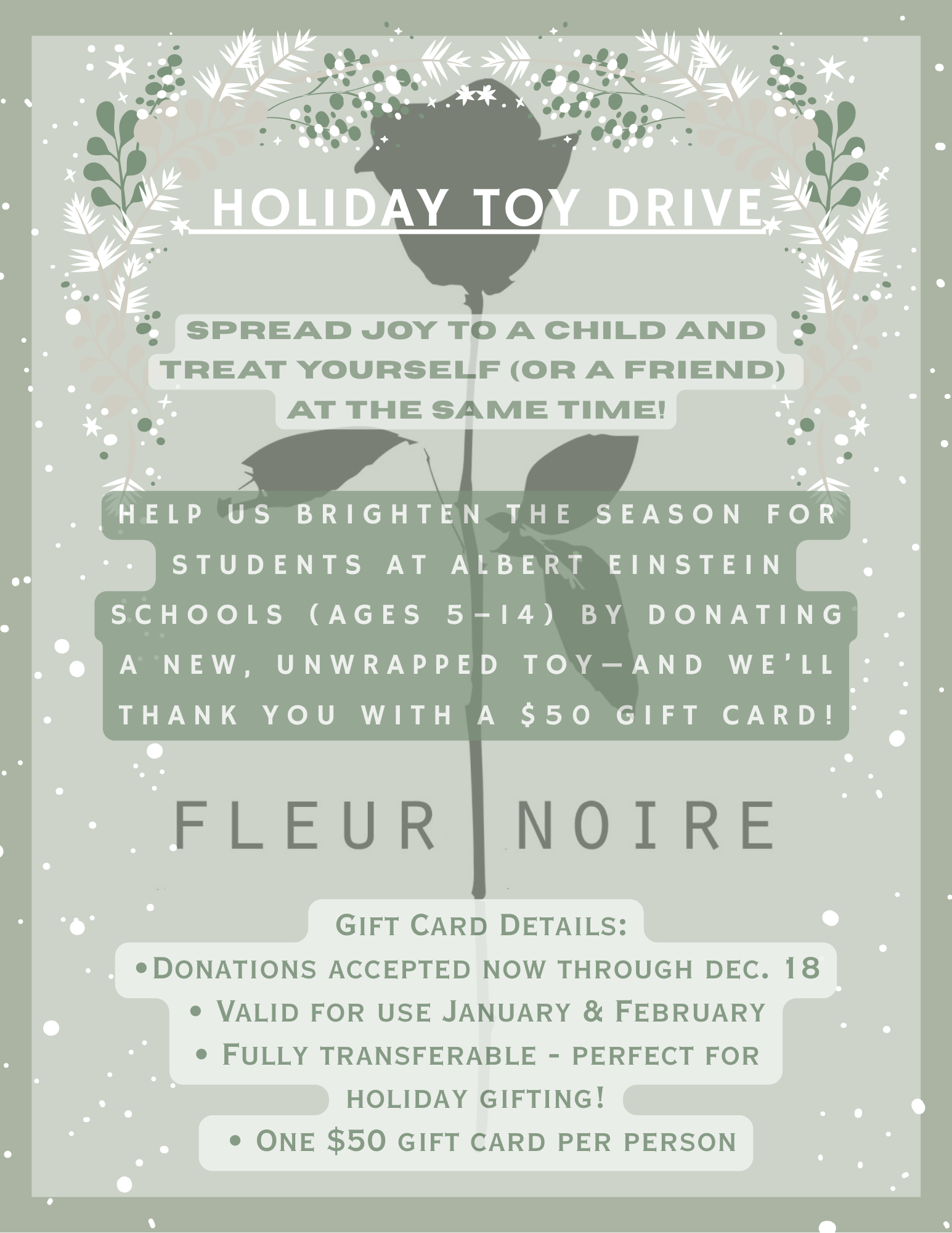 Bring a new, unwrapped toy to help brighten a student’s holiday season and receive a $50 Fleur Noire gift card as our thank-you.